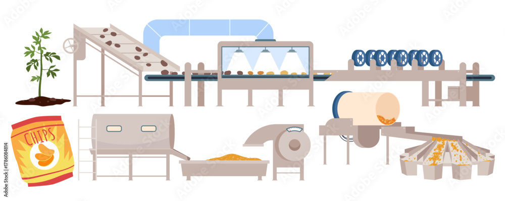 Step-by-step potato chips production from raw potatoes to packaging with factory equipment, conveyor belts, and food processing stages shown in flat style isolated vector illustration #1786084814