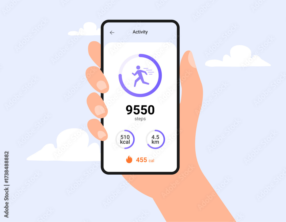 Step counter fitness tracker app design. Walk flat health fit activity vector smart phone watch step counter. #1738488882