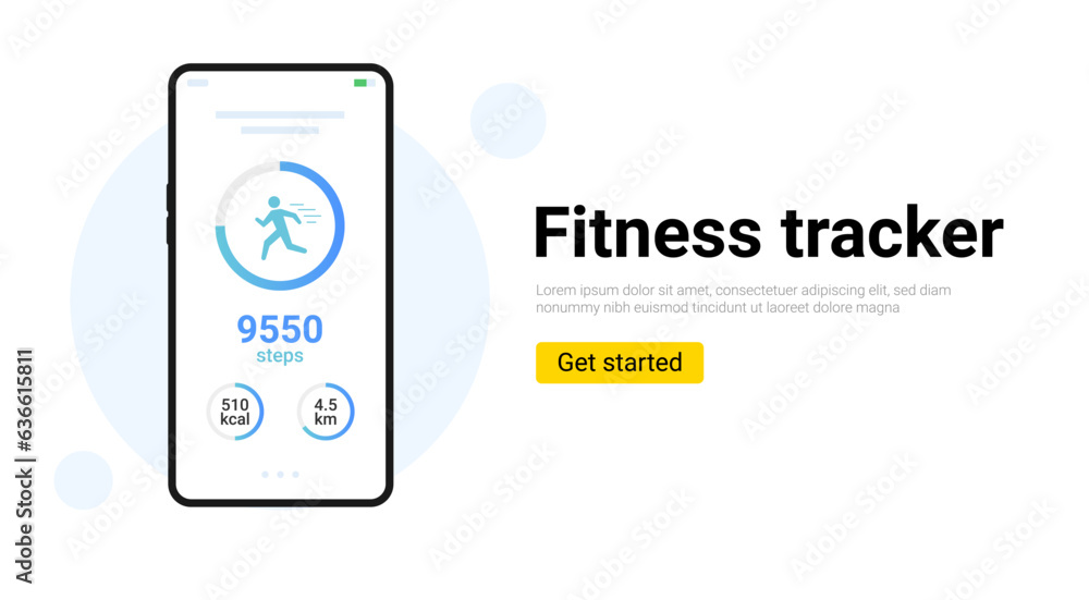 Step counter fitness tracker app design. Walk flat health fit activity vector smart phone watch step counter. #636615811