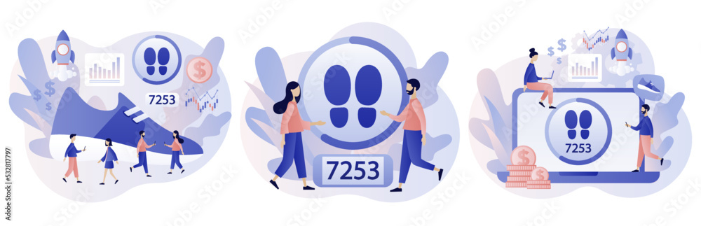 Step counter. Pedometer, fitness tracker concept. Walking to earn money mobile app. Digital sneaker. Crypto currency coin. Modern flat cartoon style. Vector illustration on white background #532817797