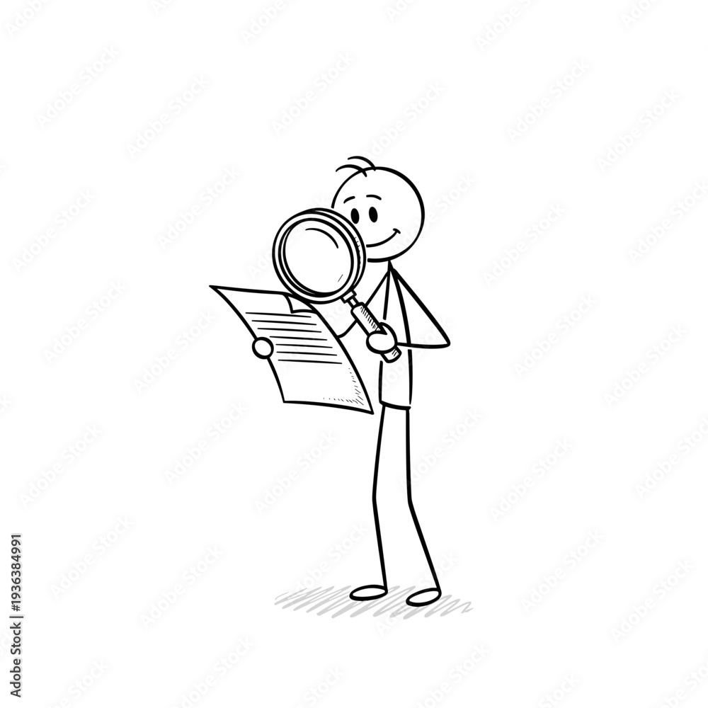 Stick figure examining document with magnifying glass in hand for presentations and marketing purposes #1936384991