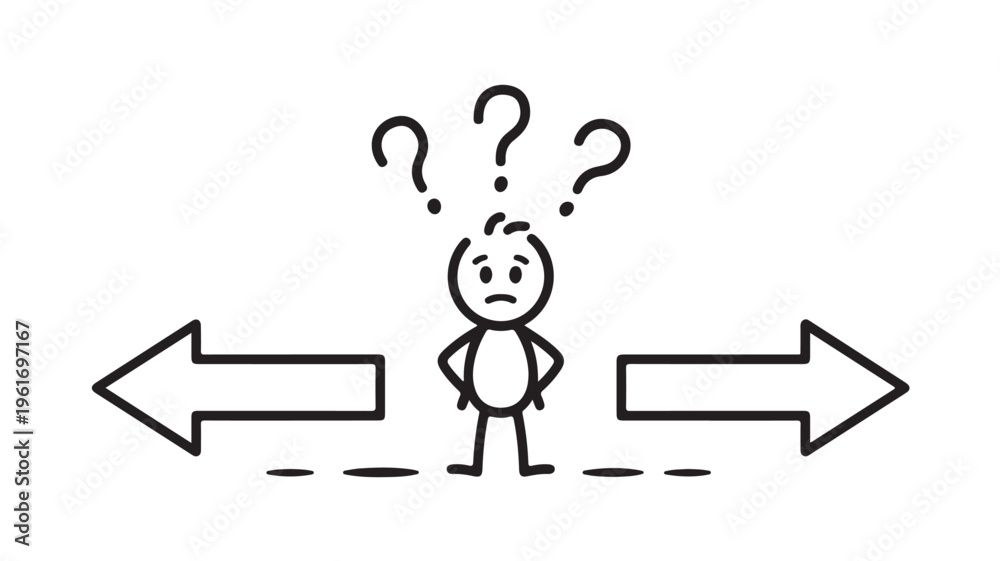 Stick figure person standing between two arrows with question marks For decision making and confusion concepts #1961697167