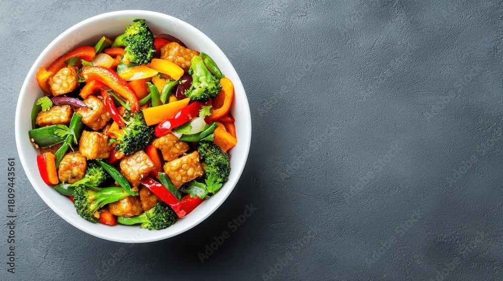 Stir fry with colorful vegetables and tempeh in white ceramic bowl, plantbased eating, Asianinspired dish #1809443561