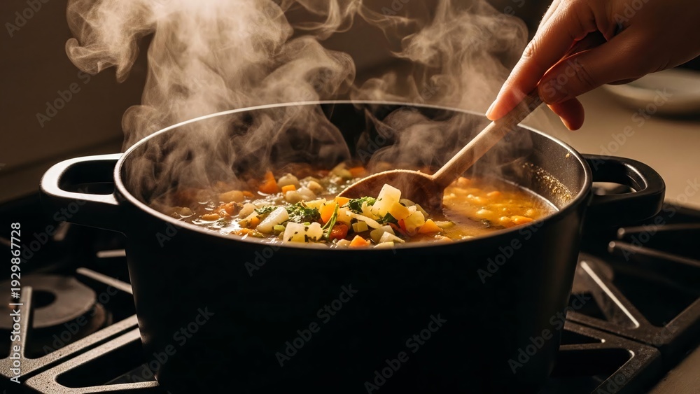 Stirring Homemade Hot Soup on Stove #1929867728