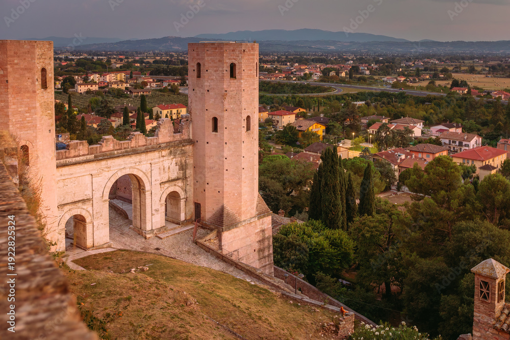 Stone archway framing quiet medieval alley in Spello #1922825324