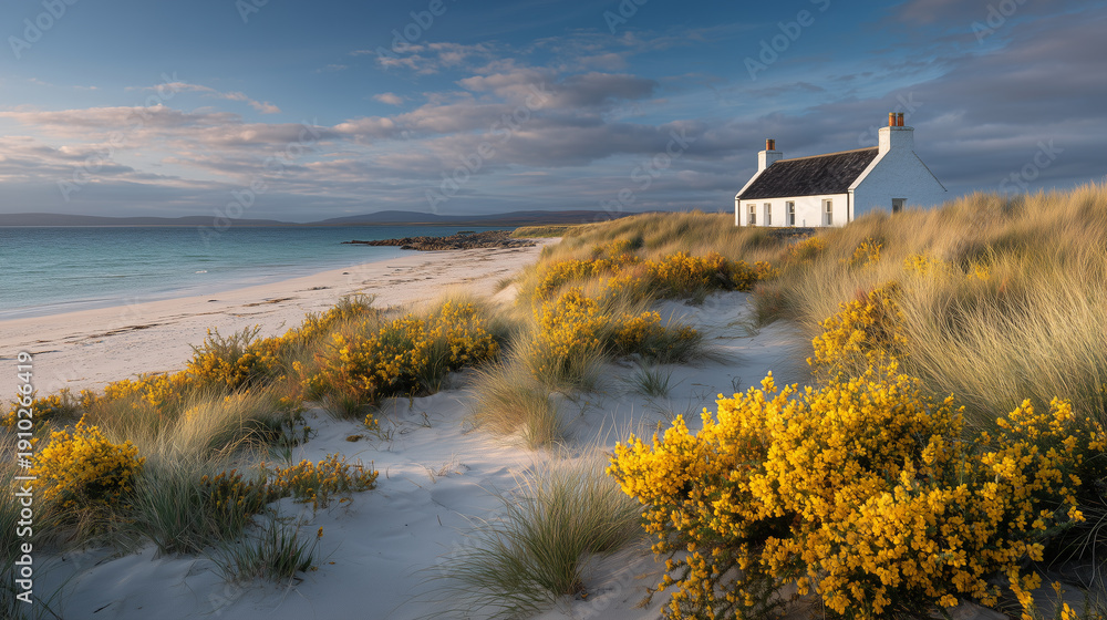 Stone cottage by the sea surrounded by simple wildflowers and rocks #1910266419