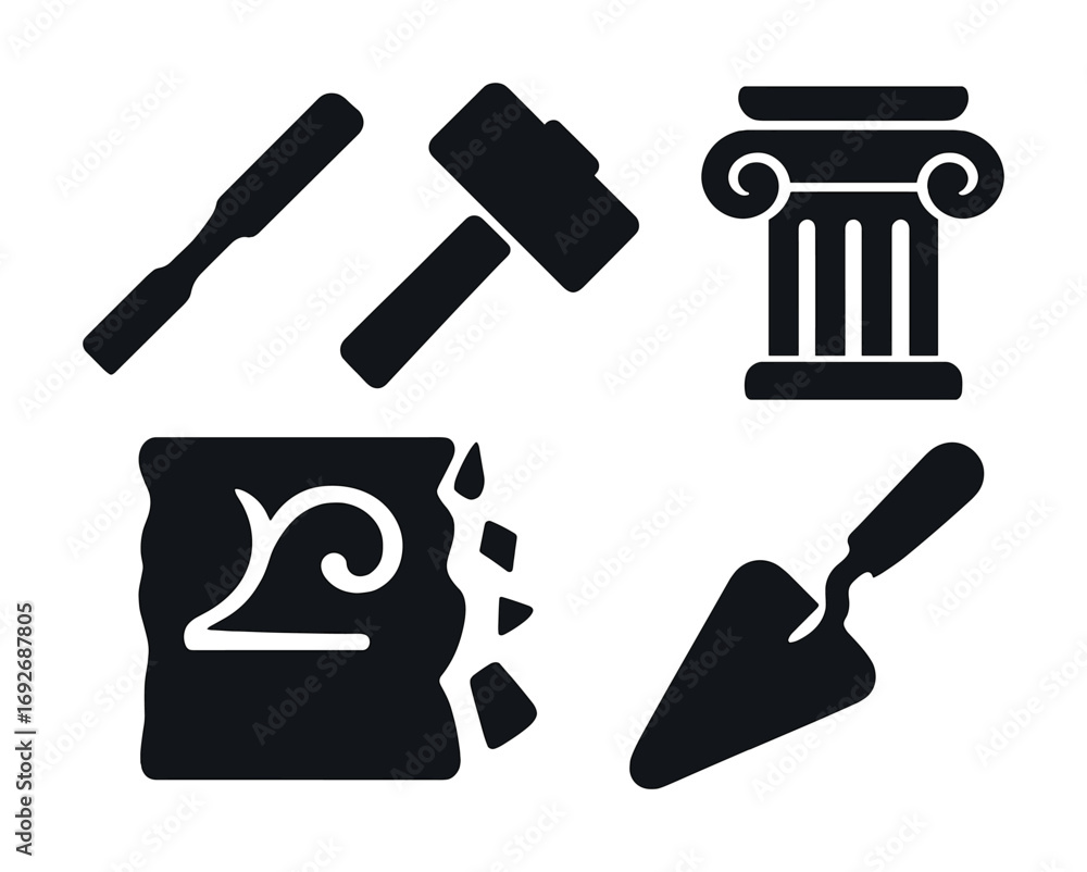 Stone masonry tools and symbols: chisel, mallet, column, and trowel icons #1692687805