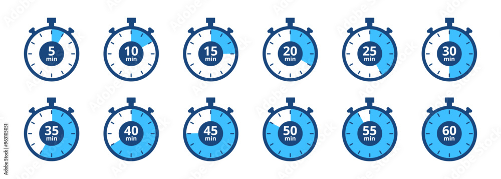 Stopwatch timer set, 5-minute clock on white background. Set of timers. Stopwatch icons. Countdown 5, 10, 15, 20, 25, 30, 35, 40, 45, 50, 55, 60 minutes - Vector Icon #963105051