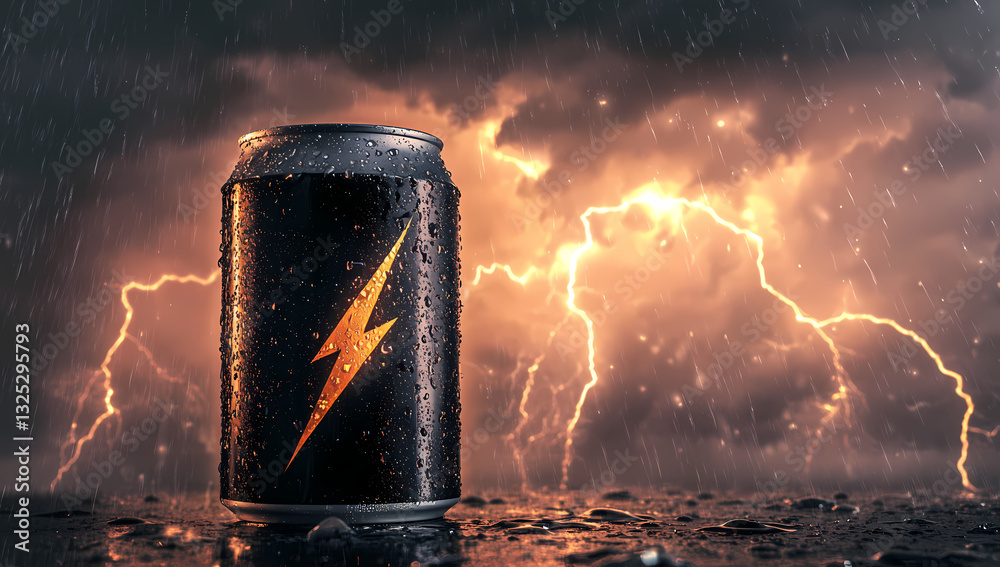 Storm Surge: An energy drink can rests amidst a dramatic storm with lightning streaking across the sky, symbolizing a burst of energy and power. #1325295793