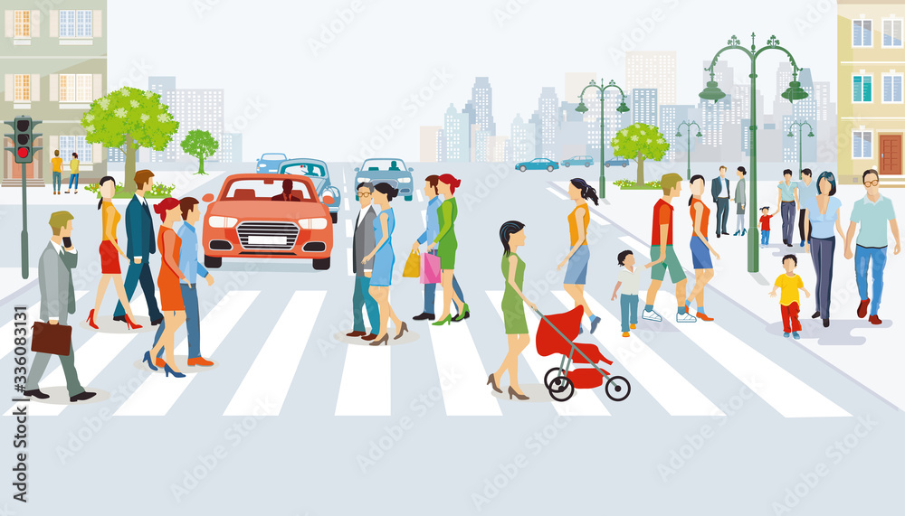 Straßenverkehr mit Fußgänger auf dem Fußgängerüberweg #336083131