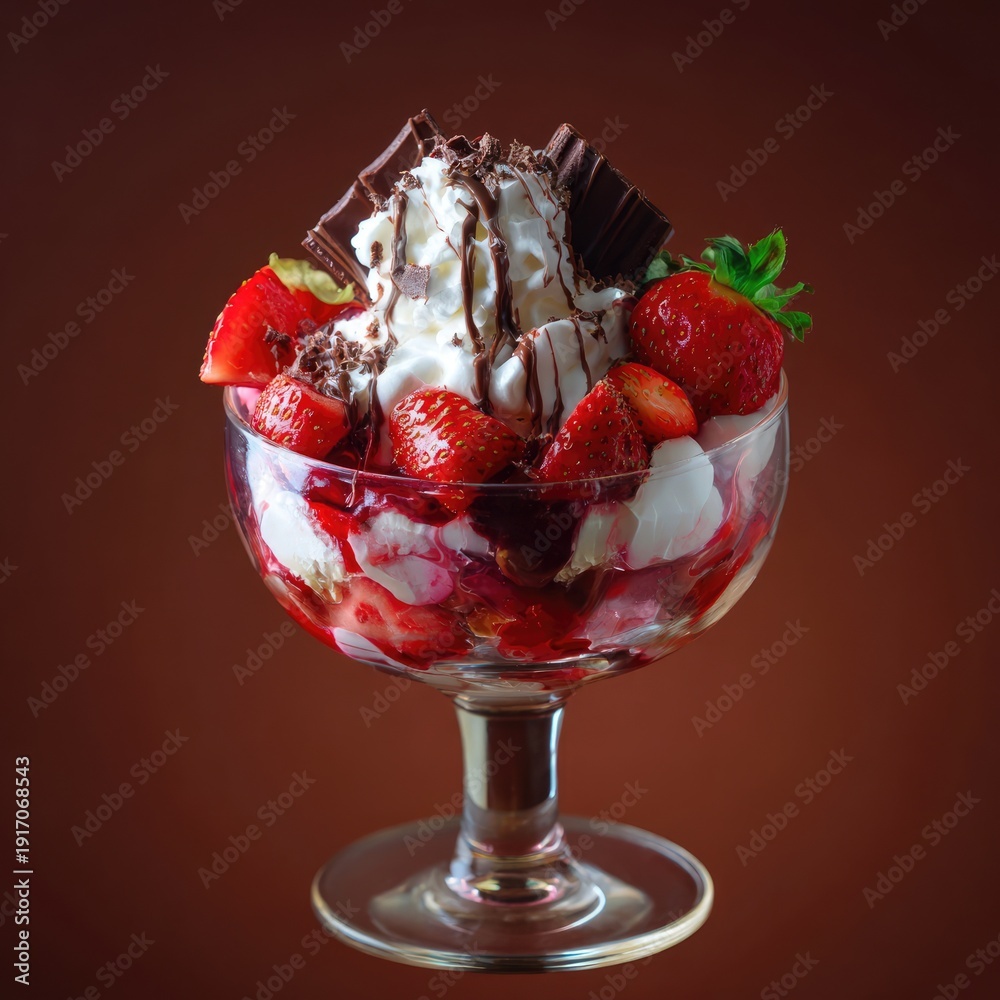 • #1917068543 Strawberry chocolate ice cream sundae with whipped cream and syrup in glass dessert bowl