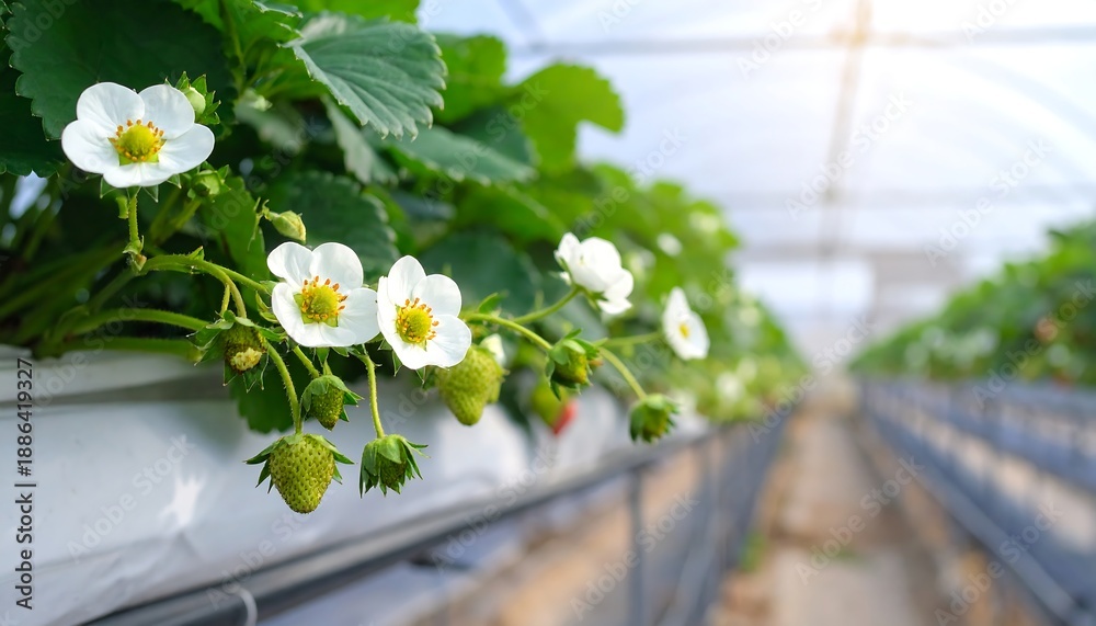 Strawberry Flowers Blooming in Greenhouse - A Close-Up View. #1886419327