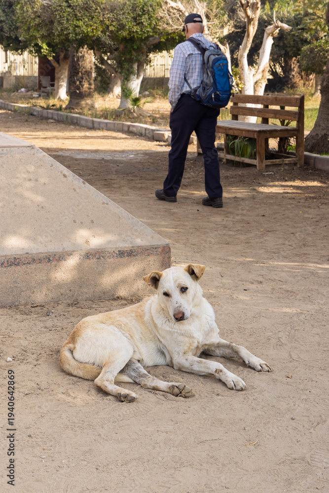 Stray dog resting in a Cairo, Egypt park while an older man walks past with a backpack #1940642869