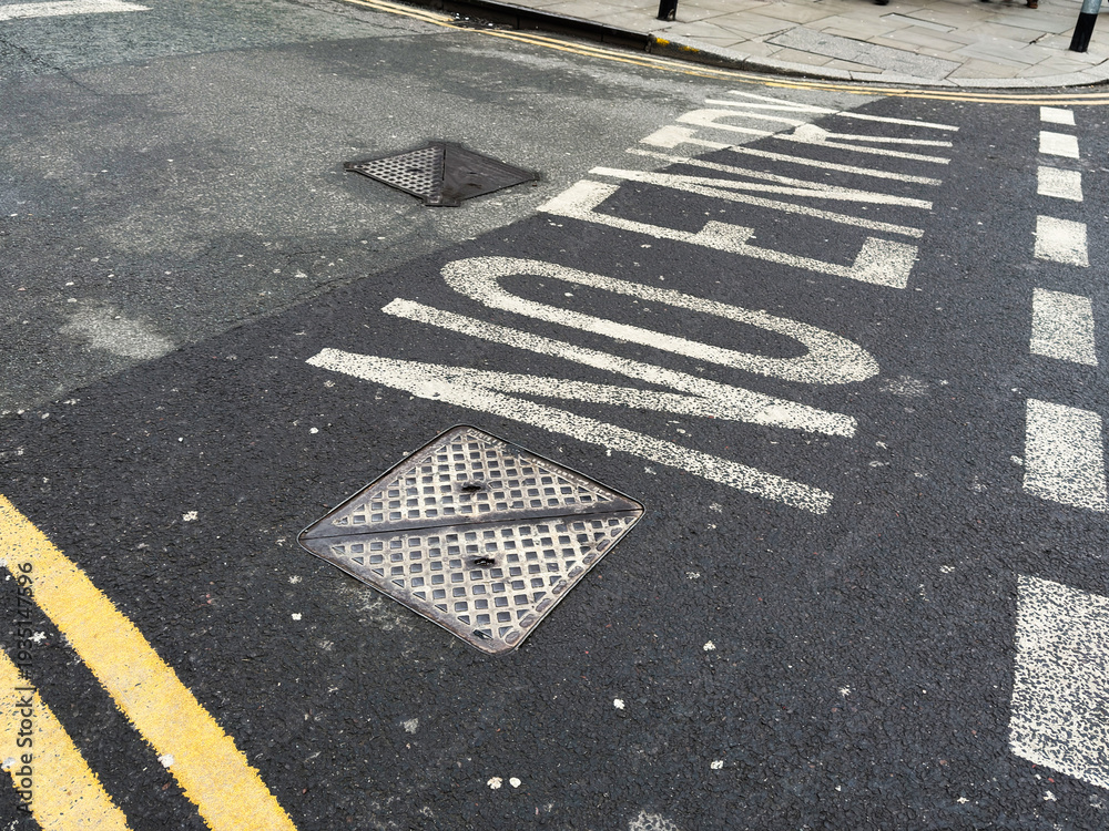 Street scene in Manchester UK with No Entry road markings and manhole covers on wet asphalt #1935147596