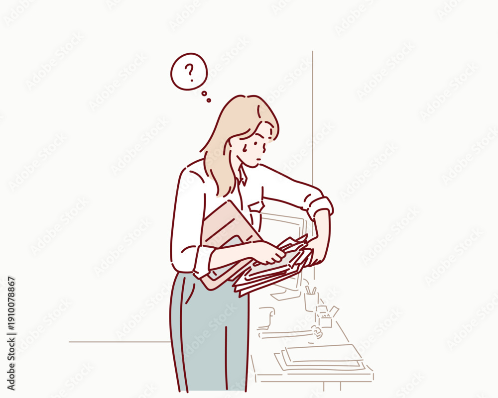 Stressed Businesswoman Frantically Searching for Documents in Pile of Paper. Original vector illustration drawn by hand. #1910078867