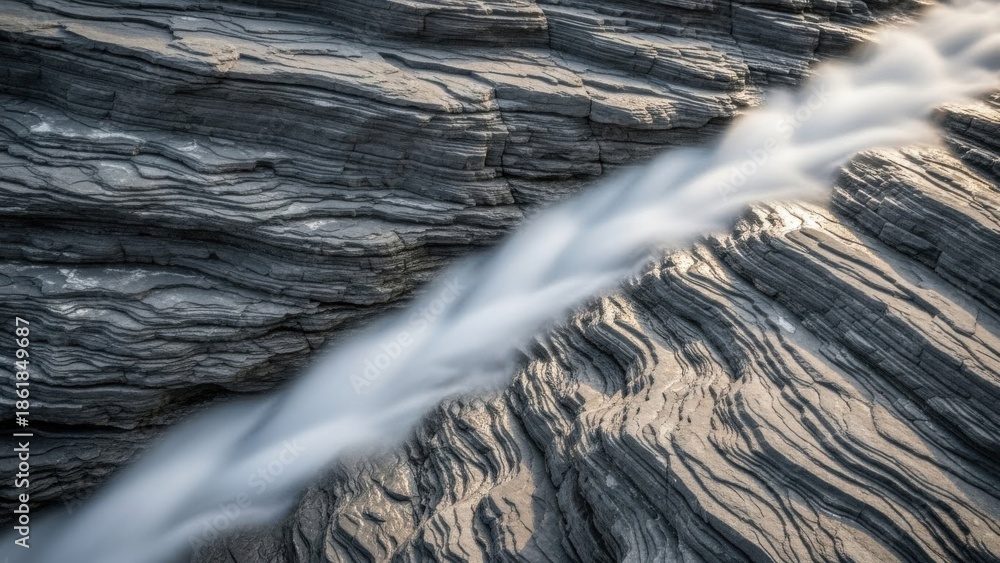 Striking geological rock formations with cascading water along layered strata #1861849687