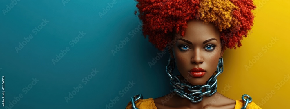 Striking Portrait of a Woman with Vibrant Hair and Bold Chains Against a Colorful Background #1312047153