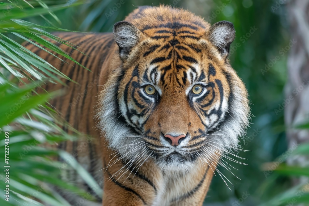 Striking tiger walking through lush greenery in a wildlife sanctuary during daylight #1712274269