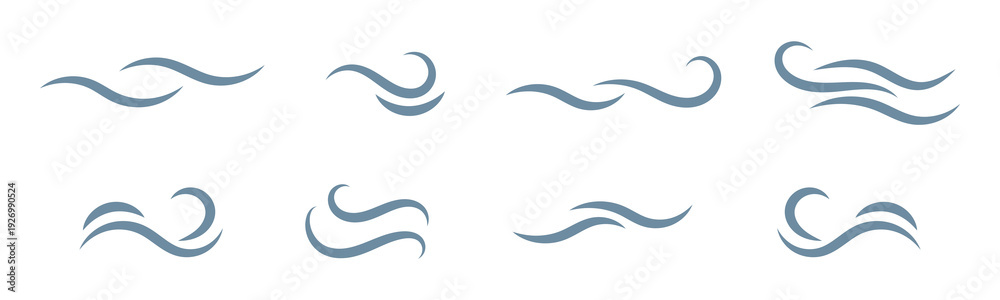 Strong wind line icon set. Windy weather, Airflow, wind flow symbol. Natural wind icons. Windy blow logo, label, badge, sticker, symbol, emblem, stamp, black, line, flat vector isolated illustration. #1926990524