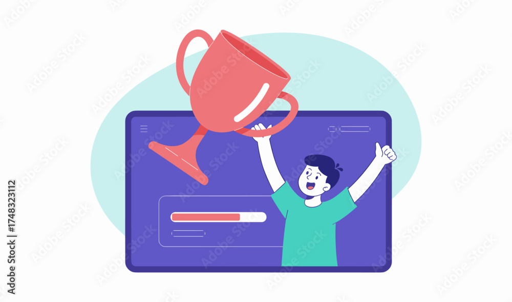 student holding a trophy from a computer screen vector illustration, online achievement and winning a competition #1748323112