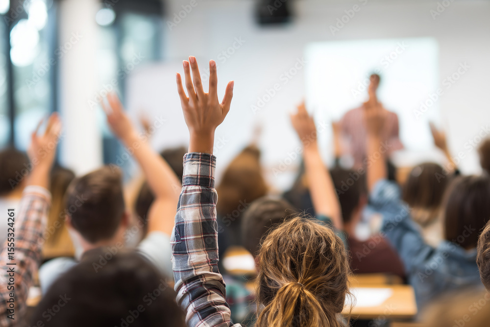 Students actively raising hands in class students engaged in education #1555324261