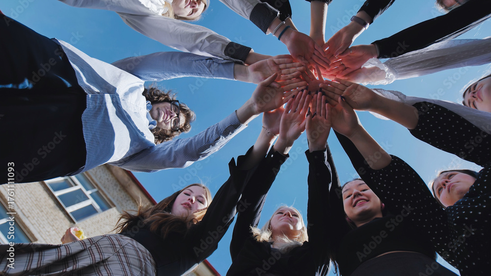 Students forming a circle and holding hands to represent unity, teamwork, and school community spirit #1761111093