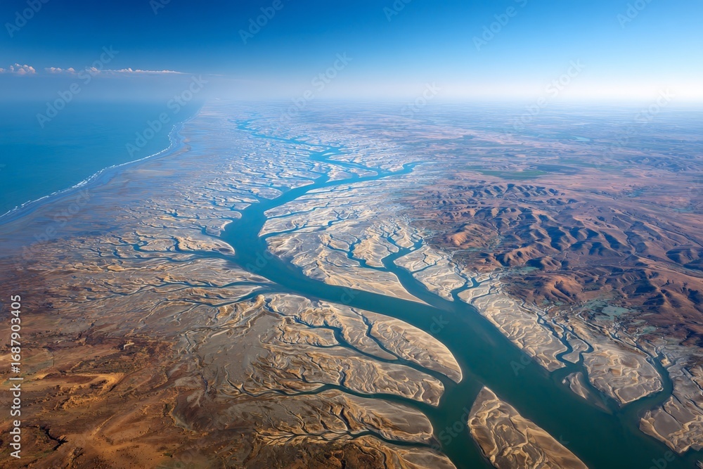 Stunning aerial view of winding river through arid landscape meeting the ocean during a clear daytime #1687903405