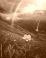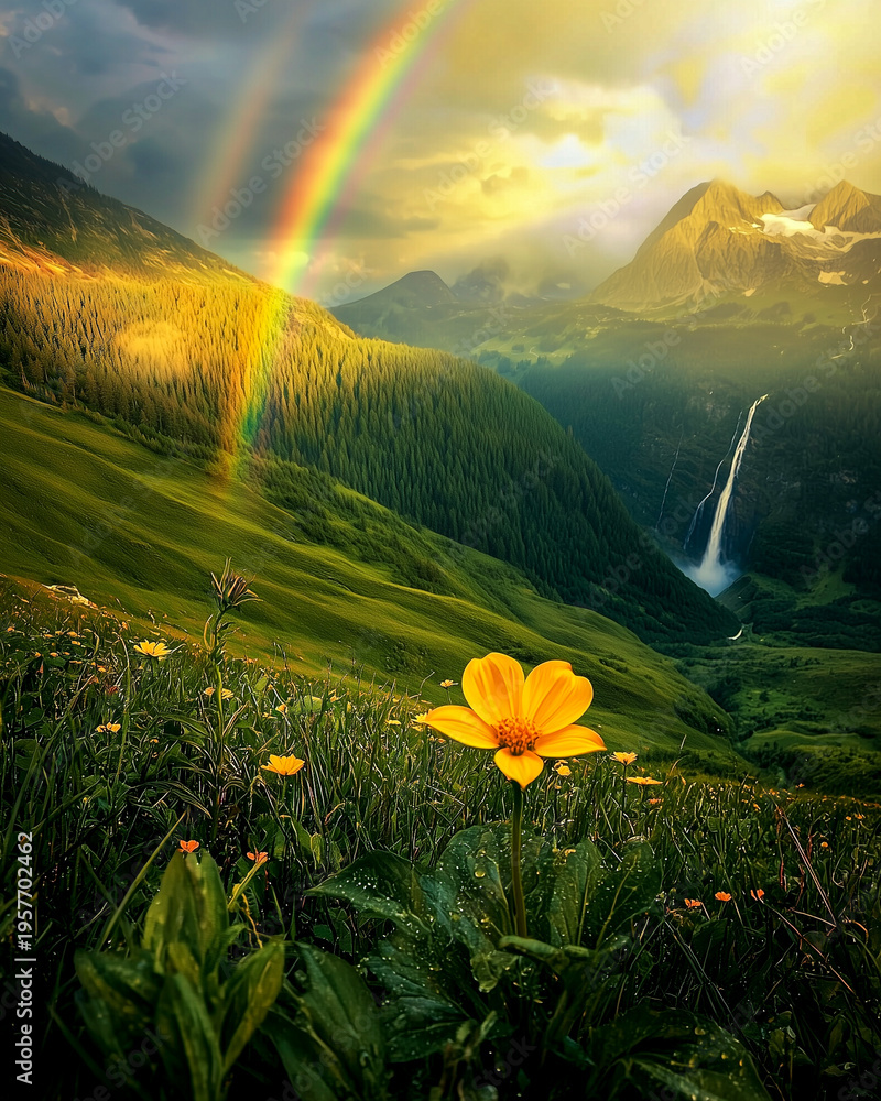 Stunning alpine landscape with vibrant rainbow, sunlit valley, cascading waterfall, and a yellow wildflower in the foreground under dramatic clouds #1957702462