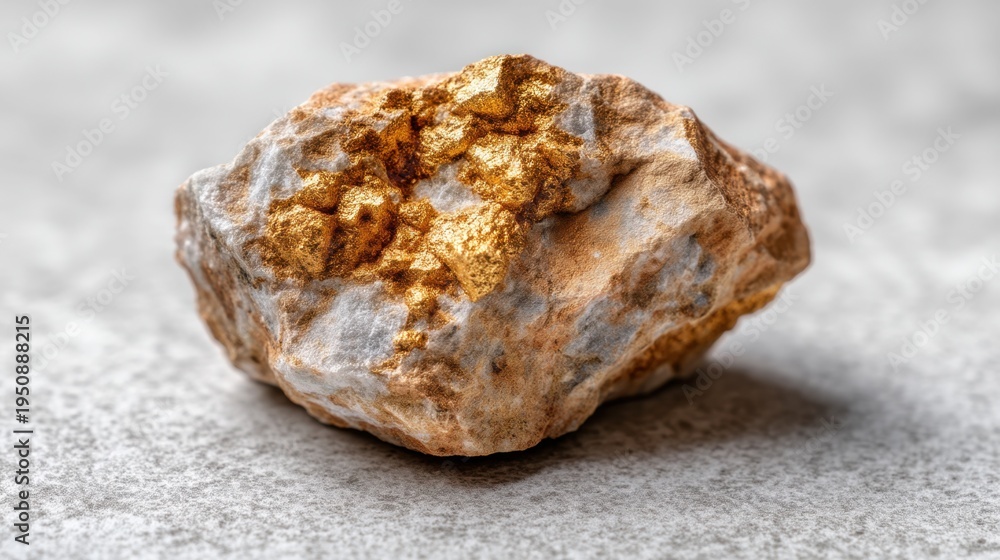 Stunning Close-Up of a Natural Rock with Golden Mineral Deposits on a Gray Background #1950888215