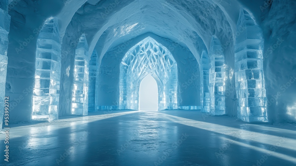 Stunning ice palace with intricate architectural details and ethereal light beams, capturing a magical frozen wonderland scene in winter. #953992712