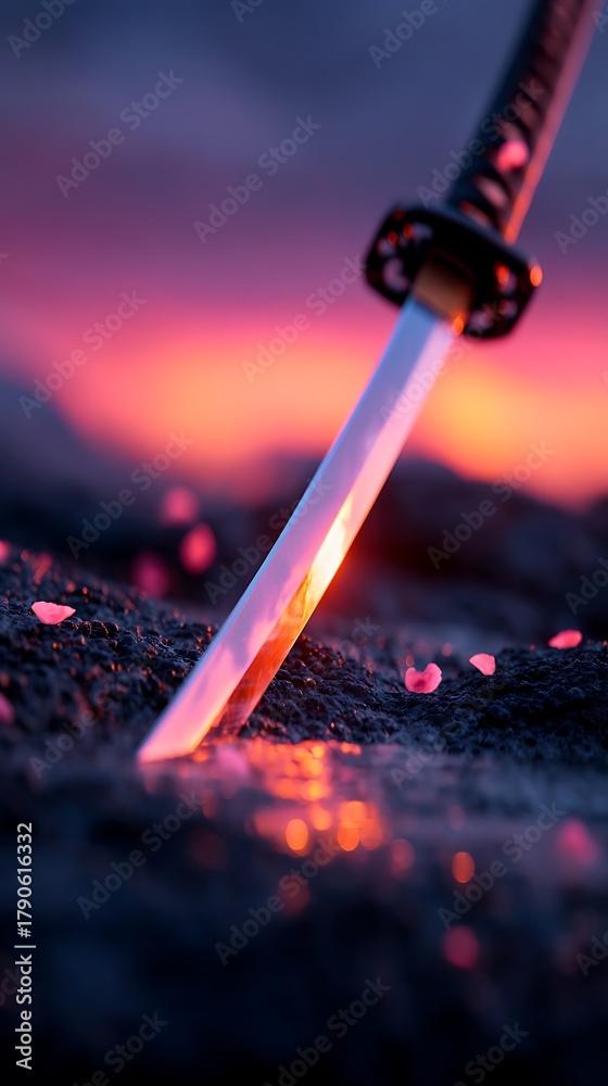 Stunning katana blade gleams at sunset surrounded by delicate cherry blossom petals #1790616332