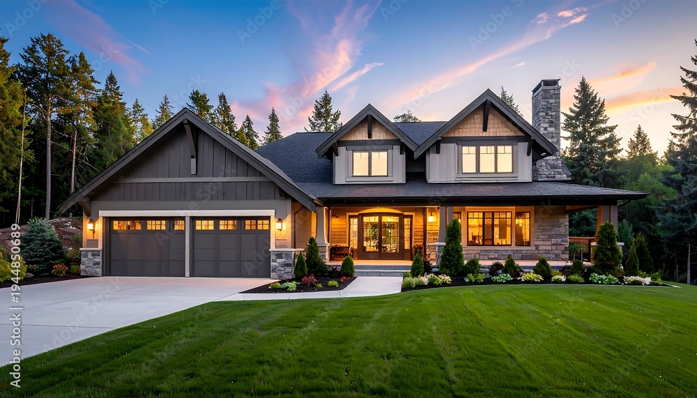 Stunning Modern Home with Lush Green Lawn and Driveway. #1944850689