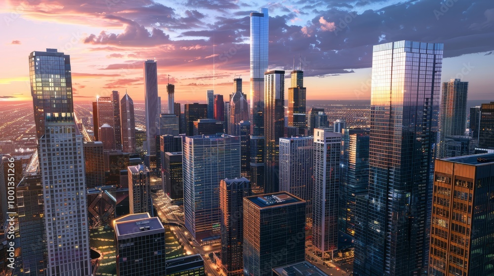Stunning sunset over urban cityscape aerial view of skyscrapers in a vibrant downtown area #1001351266