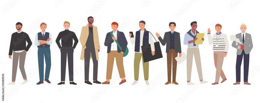 Stylish business men. Male characters in suits and casual fashion are standing. vector flat design illustration. #436801558