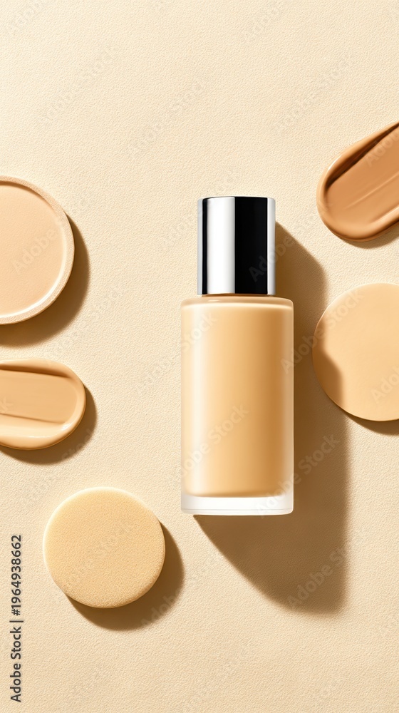 Stylish makeup foundation bottle with compact powders on a neutral background. #1964938662