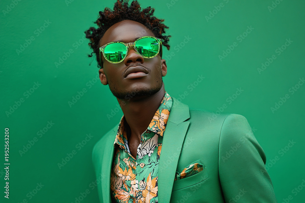 Stylish man in a modern green suit and sunglasses in a bold fashion portrait. #1952563200