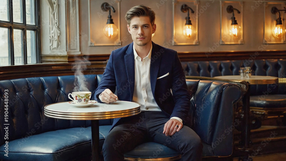 Stylish man in navy blazer sitting in elegant cafe with steaming tea on marble table in vintage interior #1904448093