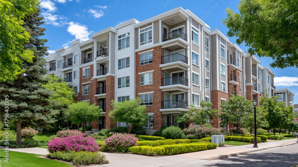 Stylish mid-rise residential property featuring red brick, beige siding, and wide balconies, surrounded by trimmed hedges and bright green grass, clear blue sky accentuating archit #1756432195