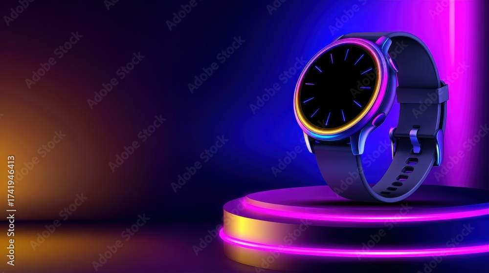 Stylish smartwatch displayed on a vibrant podium with colorful lighting, showcasing modern design elements #1741946413