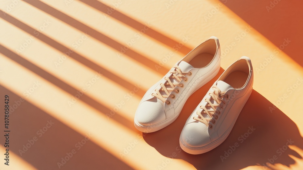 Stylish white sneakers on a vibrant orange background with dramatic shadows. #1078058429