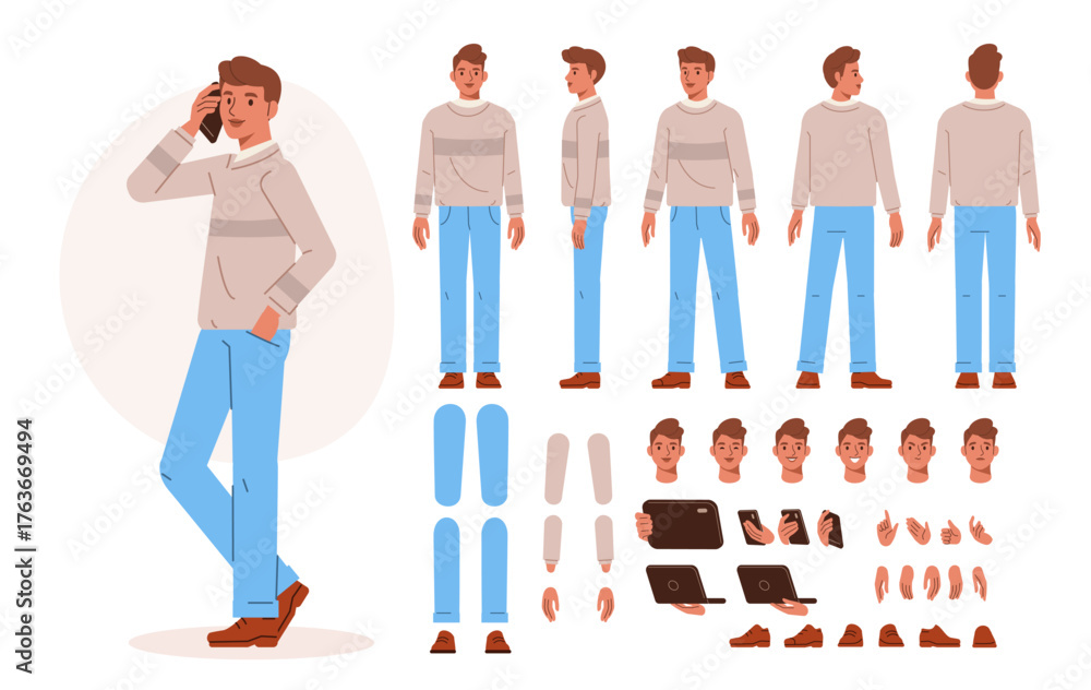 Stylish young male office worker wearing casual outfit. Character constructor for animation. Front, side and back view set. Body postures, poses collection. Vector illustration. #1763669494