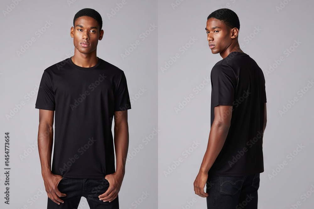 Stylish young man wearing casual black t-shirt in front and back view for fashion lookbook or apparel design concepts #1454773654