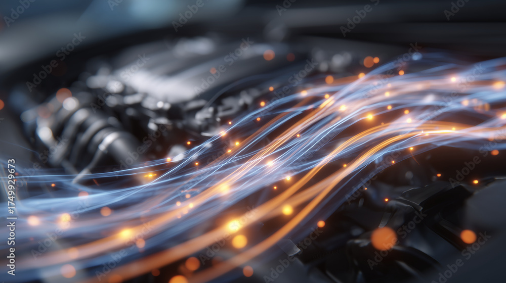 Stylized 3D concept art of engine cooling process, coolant glow traveling through fluid lines and metallic connectors, perfect for auto tech presentations #1749929673