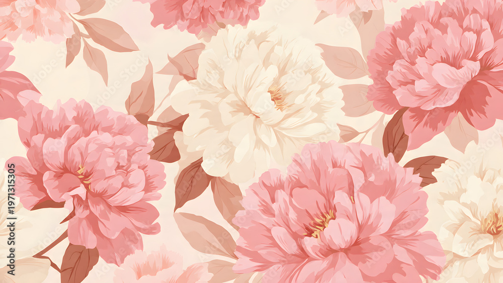 Stylized flat vector peony pattern in soft pastel pink and ivory tones, seamless floral decorative design #1971315305