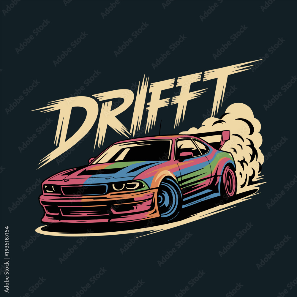 Stylized illustration features a classic sports coupe executing a dynamic power slide accompanied by billowing tire smoke and bold lettering. #1935187154