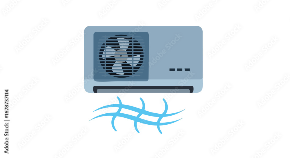 Stylized illustration of an air conditioning unit emitting cool air on a white background creating a feeling of refreshing comfort in hot weather #1678737114