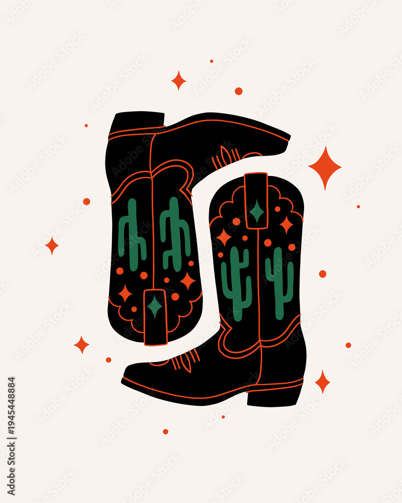Stylized illustration of black cowboy boots decorated with green cacti and orange accents, surrounded by stars. Modern and minimalist, ideal for Western-themed designs or merchandise. #1945448884
