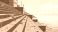 Stylized illustration of stone ghats adorned with glowing diyas at sunset, leading to a calm river with distant buildings and soft clouds. #1935049995