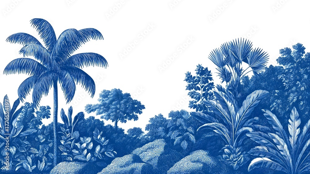 Stylized landscape featuring silhouetted palm trees and lush, botanical foliage in a tranquil, minimalist blue tone. #1770594197