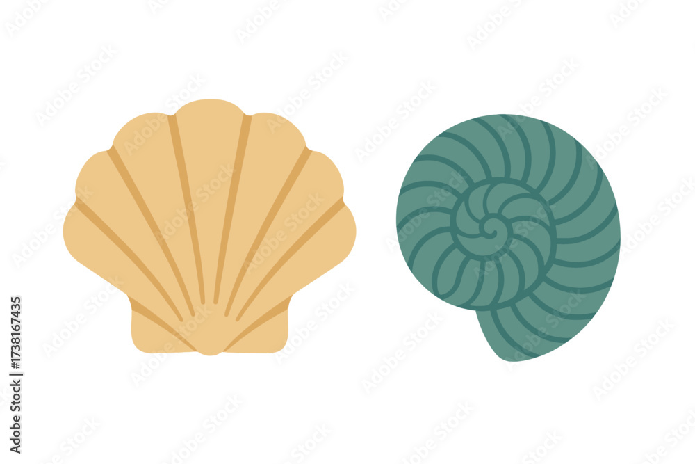 Stylized marine shells featuring a scallop and a spiral nautilus design #1738167435